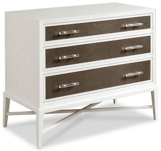A terrific storage chest with neo-classic style roots has a rectangular top resting over three drawers enveloped with Woodbridge Gray leather. The chest is elevated on tapering legs joined by a low "X" stretcher.Read More
