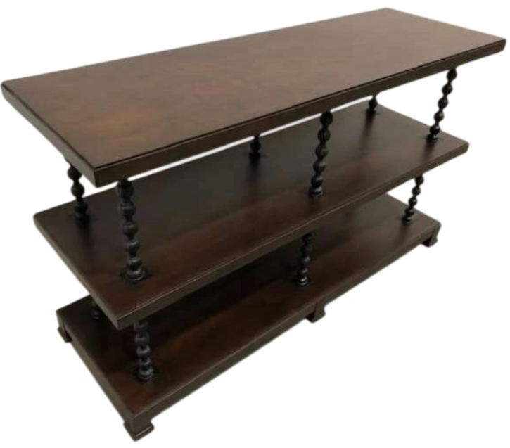 A molded hand planed cherry top is placed over rounded cast iron posts joined by two low shelves. Make a bold statement by incorporating this stunning furniture into your home. Offers a versatile solution with options to tailor finishes and details.Read More