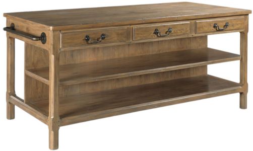 A significant design for kitchens inspired by the Arts and Crafts style movement featuring a weathered finish rough sawn texture. The rectangular planked top rests over sturdy chamfered posts and an apron rail that is fitted with three drawers over two handy shelves.Read More