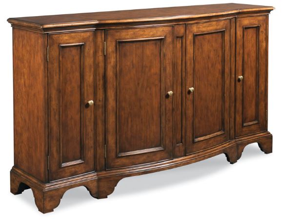 A beautifully molded cherry top rests over a pair of bow front center doors that are flanked by two additional smaller doors. The case is raised on a bracket base.Read More