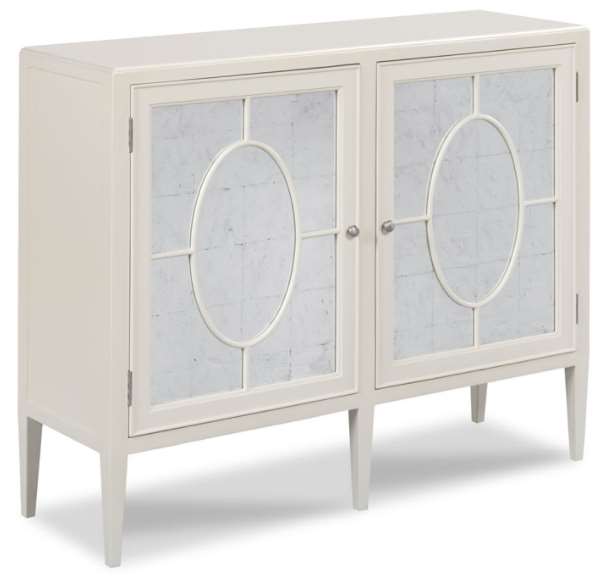 A handsome neoclassic styled multi-purpose cabinet with a rectangular top over squared posts flanking framed doors that are accented by graceful fretwork patterns over a silver leaf glass panel. The cabinet is fitted with adjustable shelves.Read More